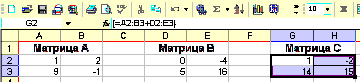3. Нажмите комбинацию клавиш Ctrl + Shift + Enter. После выполнения операций в диапазоне ячеек G2:H3 будут помещены результаты вычисленных значений элементов результирующей матрицы С (рис. 5).