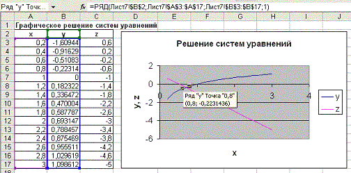 3. Подведите указатель мыши к точке пересечения графиков функций – отобра-зятся координаты точки пересечения (0,8; -0,2231436). Таким образом приближенное решение системы получено.