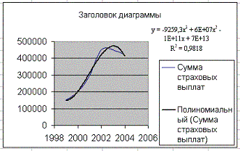 Пример 14. Имеются сведения о величинах страховых выплат по годам, представленные в таблице. Требуется исследовать характер изменения величины страховых выплат и подобрать интерполяционную функцию.