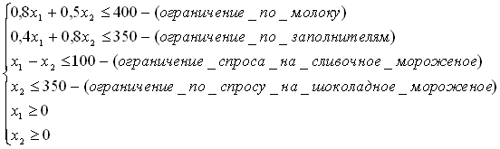 Суточный спрос на сливочное мороженое превышает спрос на шоколадное не более чем на 100 кг. Кроме того известно, что спрос на шоколадное мороженое не превышает 350 кг в сутки. Отпускная цена 1 кг сливочного мороженого 16 ден. ед., шоколадного – 14 ден. ед.