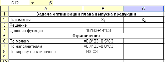 2. Полагая, что неизвестные (x1 и x2) будут размещаться в ячейках В3 и С3, в ячейку В4 введите формулу целевой функции: = 16*B3+14*C3, а в ячейки В6, В7 и В8 – формулы ограничений (см рис.30).