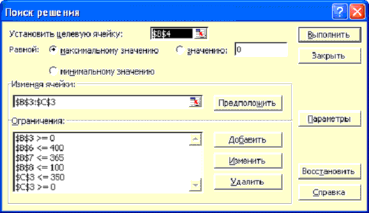 2. Укажите в диалоговом окне ссылки на целевую ячейку, на ячейки, в которых размещены параметры целевой функции, а также введите все ограничения.